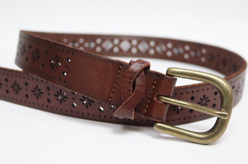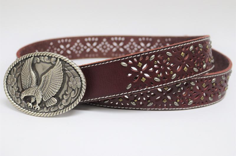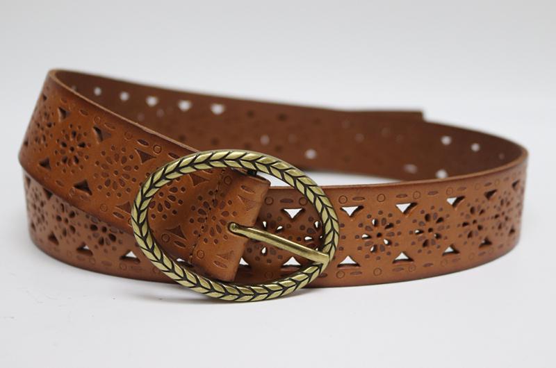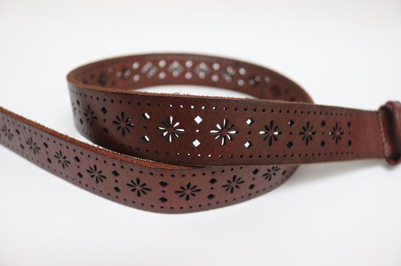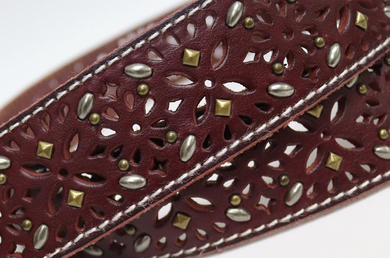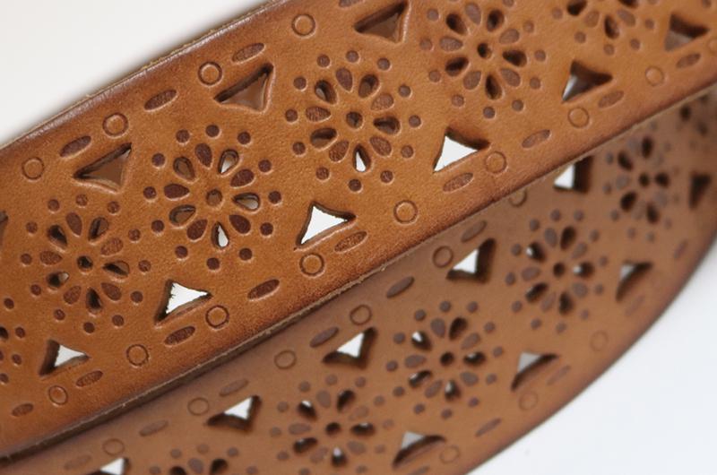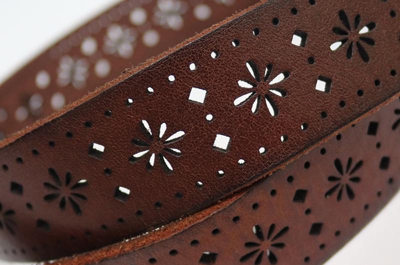 Características del materialComo regla general, utilizamos piel como la primera opción de material de fabricación de estos cinturones troquelados. La mayoría de los cinturones están hechos de una sola capa, debido a que la piel es un material de peso considerable, a diferencia de los cinturones de PU, los cuales necesitan de varias capas de material para ganar espesor y peso. Por esa razón, los cinturones de piel ofrecen uniformidad de color en las vistas de los orificios troquelados.
